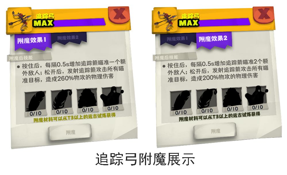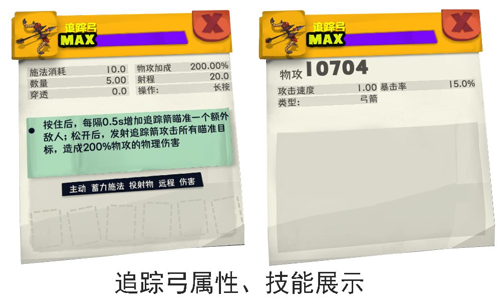 追踪弓初始攻速一般,由于技能需要蓄力释放,适合长距离作战,机动性较差,缺少回复,技能覆盖率低。可选择蓄力加速、暴击率、暴击伤害、射程、命中等属性搭配。