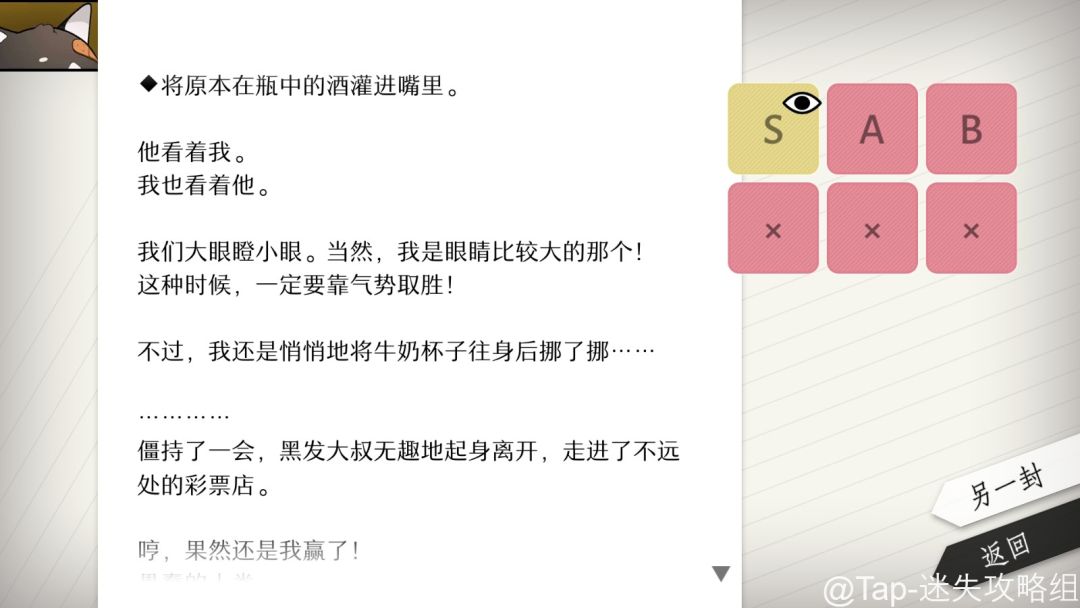 S级结局:将原本在酒瓶中的酒灌进嘴里。
