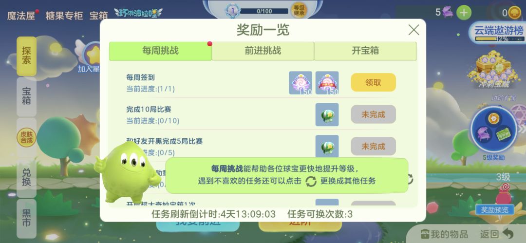 有球宝可能会问,任务有点难完不成怎么办?不要担心,我们都帮你考虑到啦!每周挑战可以点击刷新更换任务,总有适合你的任务,轻轻松松拿奖励吧!