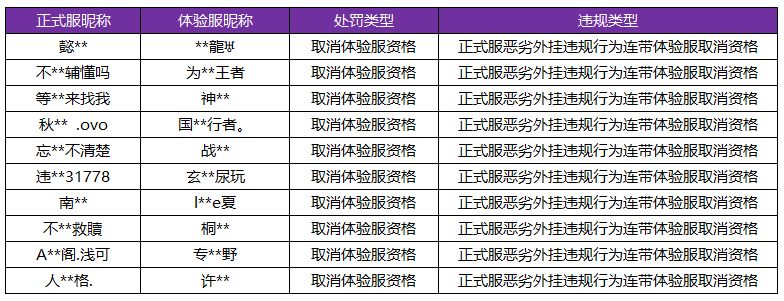 对于在体验服内使用外挂的玩家,将会跟进情节严重情况处以不同时长的封号、同时连带至正式服封号处罚并且公示。