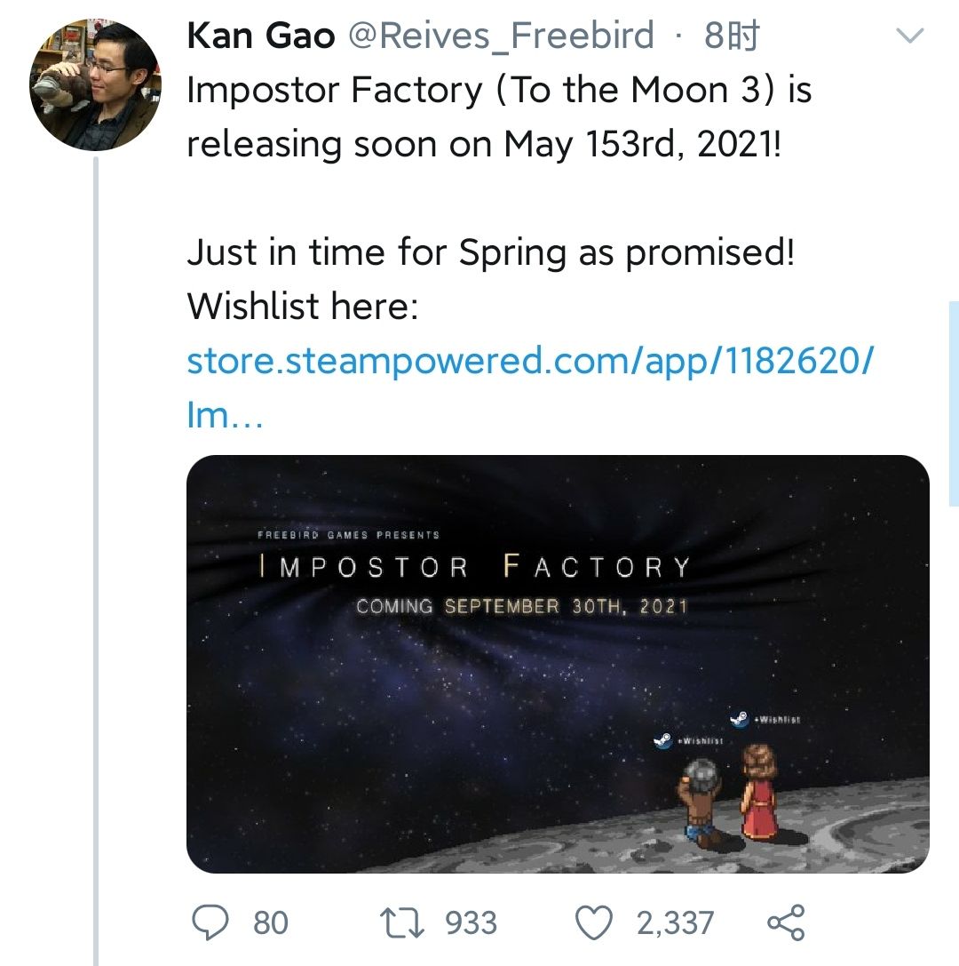 原“春季发售”的《影子工厂》定档5月153日(9月30日)Steam上线,支持中文。