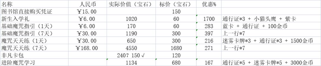 那只能把这个图再发一遍了,优惠一栏数值越高越推荐购买。如果有多余的钱,每天买个非凡卡包也是稳赚不亏的。这里的稳赚不亏仅仅指去直接买图书馆通行证。