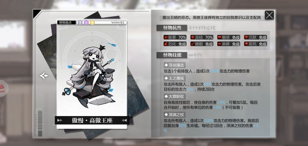 傲慢在第三回合会放一次全体伤害,这伤害基本全队残血,练度低的T吃了1-2回合傲慢普攻加第三回合全体伤害血量基本见底了,除了主c状态良好,其他4个不是半血就是残血,然后第四回合傲慢奥义下去,4个全死,只活一个主C,这时候基本退出去sl重新来了。