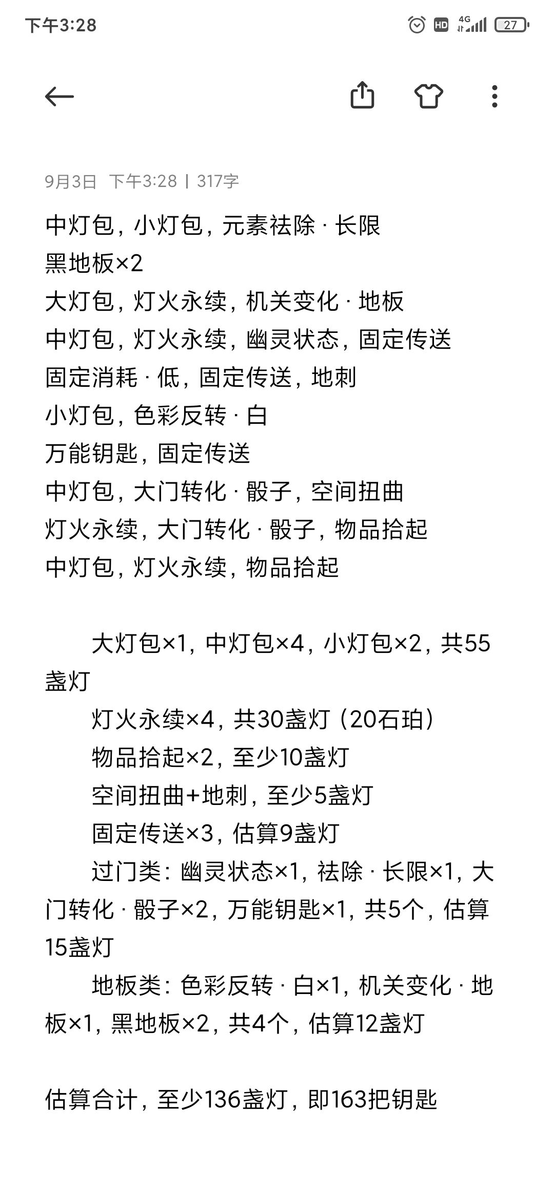 按1石珀=1.5盏灯,1宝箱=5盏灯=6把钥匙计算,一次正常通关30点体力,就算运气拉满也才10个宝箱(=50盏灯=60把钥匙),而我平时一把收益大多数情况下只有7、8个宝箱(相当于35~40盏灯。虽然会掉落道具,但也会用掉道具,所以不计算道具收益)。