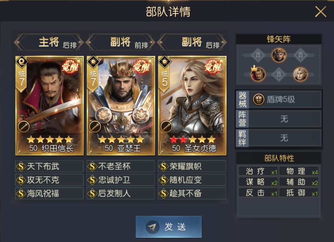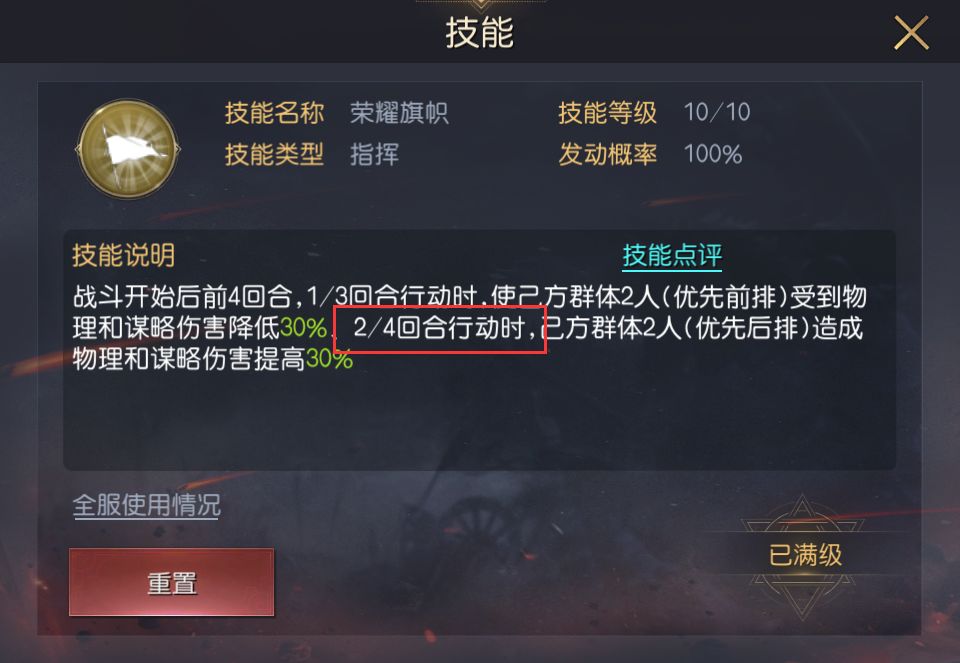 由于在2/4两个回合拥有了稳定的会心,所以现在完全可以将所有输出压缩到这2个回合以内,保证天下布武能触发极高的全体伤害,再配合忠诚护卫或圣象等减伤技能之后效果更好,另一个技能使用攻无不克补充伤害即可。输出能力和稳定性完全不亚于法刀队伍。并且有后发制人和荣耀旗帜这个技能存在,前2回合该队伍的承伤能力优于目前绝大多数阵容。