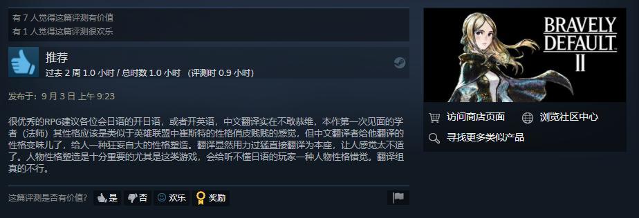 游戏发售当日截止到本文出稿共收到42篇测评,其中95%为好评,差评的主要原因是游戏的中文翻译过于蹩脚,这个问题在Switch版发售时也被玩家诟病过,但是开发者并没有对其改进就直接在Steam上发布了,这引起了一些玩家的不满。