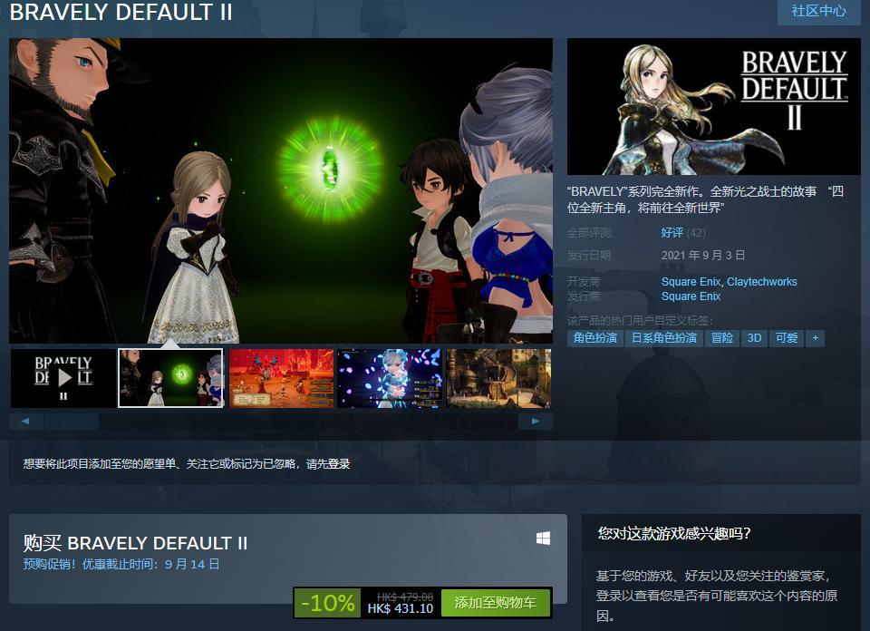 由《八方旅人》开发团队打造的RPG游戏《勇气默示录2》今日(9月3日)Steam正式发售,支持中文,首发开启9折优惠,折后价341.1元。目前Steam评价为好评,42篇评测中95%的玩家给予了好评。