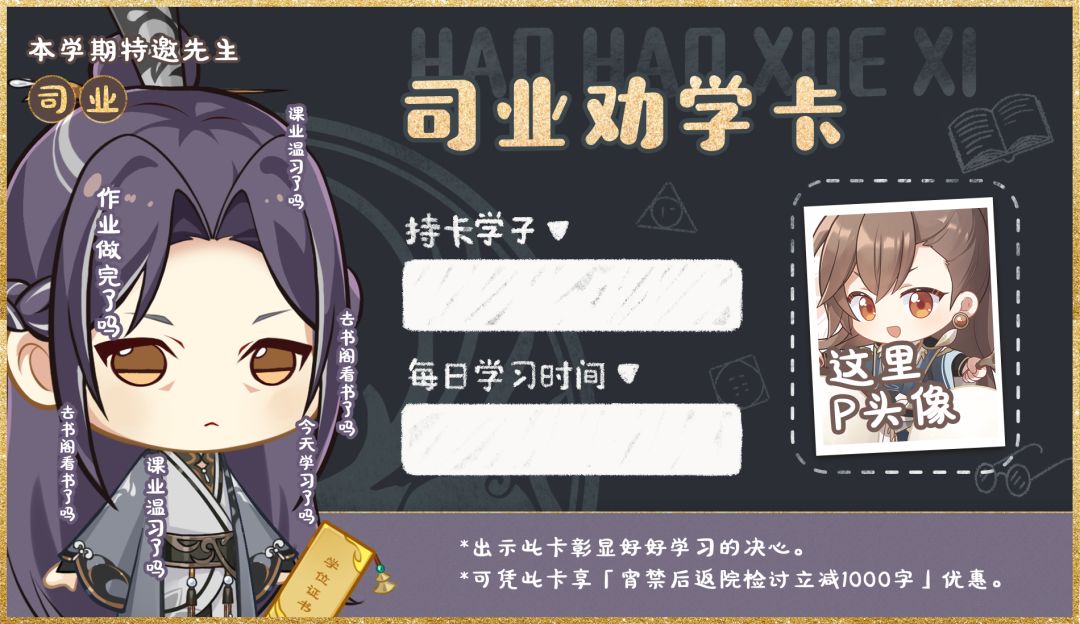 选取任意学生卡模板,P上你的头像和信息自制学生卡,9.3-9.10带前缀【学生卡】发布至#花亦山心之月[超话]#(划重点,超话哦),即可参加书院学生卡分享活动~