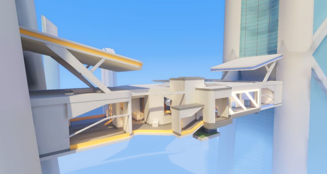 概念设计来自玩家先知先觉,这个赛场突破了原有团队对抗模式中突破 2 层结构玩法,它的 3 层结构更复杂,并增加了新的机制——升降电梯!