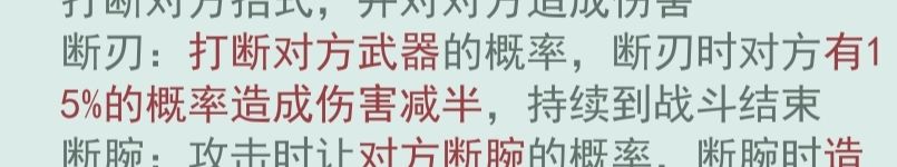 断刃,打断敌军武器,使敌人有15%概率伤害减半,持续到战斗结束。