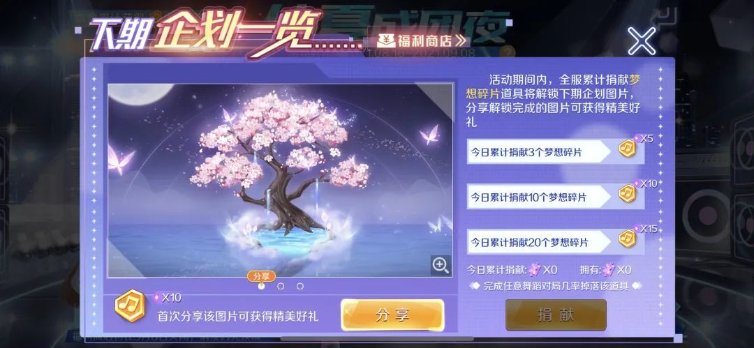 9月1日至9月8日期间,全服累计捐献梦想碎片道具将解锁下期企划图片,分享解锁完成的图片可获得音律币好礼!
