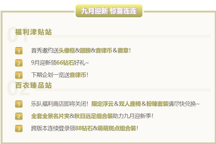 截止至9月8日,乐队福利商店即将关闭!限定浮云、双人座椅、粉臻美衣、臻品时装、高档服饰、极光经验券、聊天气泡、限定称号、限定头饰、小家图纸礼包、轻科技礼盒、动作卡、练习生团服等好物请小主人们抓紧时间,尽快兑换~