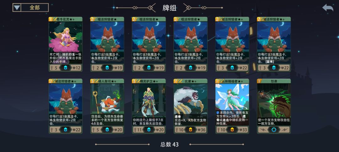 2上场生物卡抗伤害,建议低费卡(精灵护卫很牛逼,因为你最多三回合就可以7_8法力上限激活他了,前期过度最合适的生物卡,也可以上噬法狩猎者)