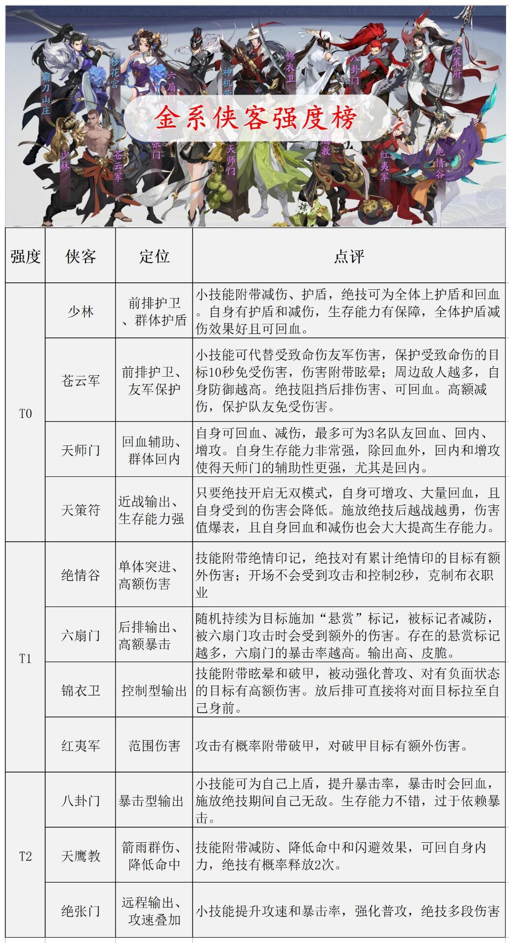 游戏画面可圈可点,水墨国画风比较少见,游戏机制很典型的放置类游戏,此类游戏最重要的资源就是人物质量和等级(挂机经验给的太少了,这点不得不吐槽,挂机一晚上不够一个人物升三级),先说人物质量,游戏内角色品级提升需要大量本体卡以及本属性狗粮卡,卡片来源主要有客栈(抽卡基础)、前缘桥(选定角色定向抽卡)、各种活动商店(大部分热门角色都可兑换,资源积攒程度尚可),大侠紫色蓝色侠客残缘(平民玩家狗粮主要来源,大部分活动都给碎片),所以建议平民玩家前期(能合出白卡以前)资源紧张,看自身拥有角色的情况,每个属性选择一名角色重点培养,这个游戏良心的地方在于角色升级所有资源可百分百重置返还,培养不对可随时重置,所以找比较热门的角色进行培养就好,下面附上各属性人物热门情况(图片来自官方群)。