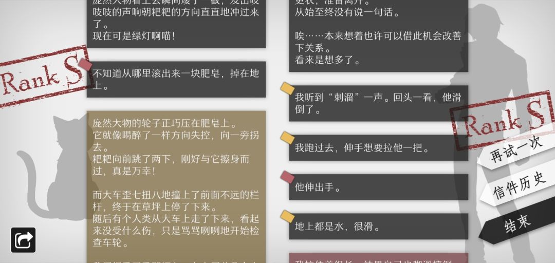 没有新信件,我能说什么,BUG 还是我白完了?两封信(我是喵与浴室里的尴尬事)只能一封有S (总共五段白色对话,大黄需要一段,张京民需要五段)。