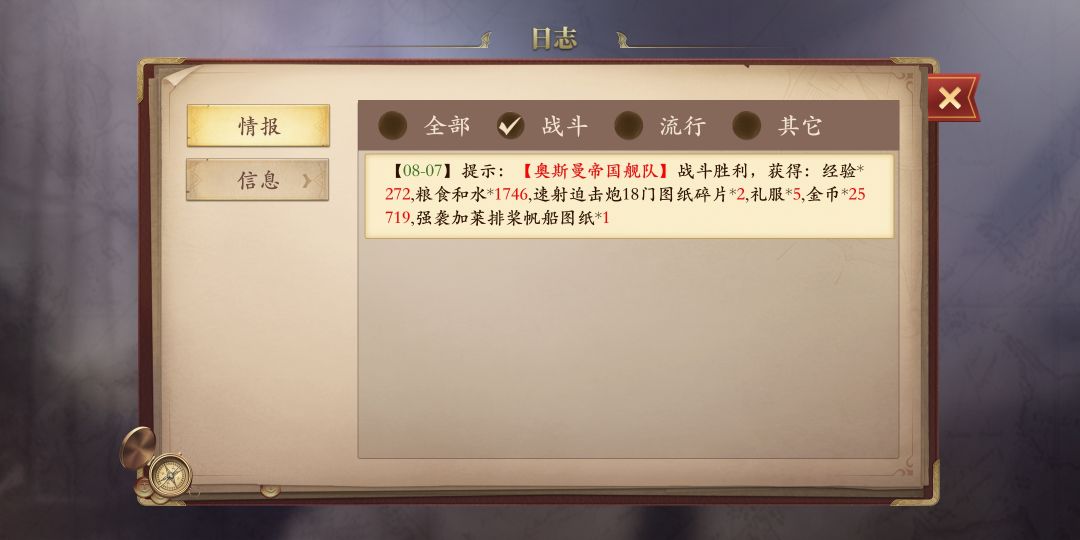 游戏中,最下面一排的“任务”——“线索”,可以查询船员、船只、宝物的条件,但这些线索都是进去城市在酒馆处喝酒或是码头、旅馆才能获取的。
