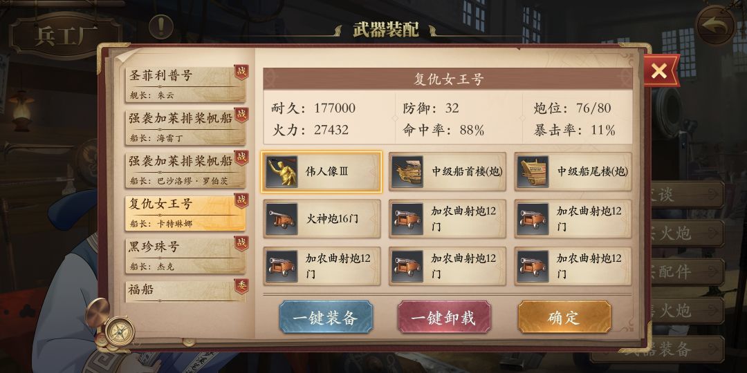 朱云简单开局,无双辈刷到55级,算中后期吧,霸者之证拿了3个(东亚、印度洋、还有一个加单挑几率的枪)。舰队方面,第一个300钻买了黑珍珠,任务肝出了复仇女王号、菲利普2个,打奥斯曼国家队拿了2强袭排船。