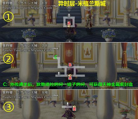 隐藏要素:外传通关后,且第1把天神武器已强化完成,到异时层米格兰斯城2楼左上狄雅德拉的房间,从右边可到镜子房间,在最左边找到天神金属密封盒,用于打造第2把天神武器。 流程见文末附录1