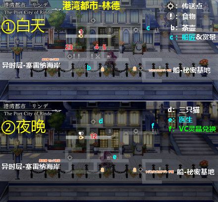 地图:①是白天地图,②是夜晚地图,可在林德旅馆或船-秘密基地旅馆睡觉切换