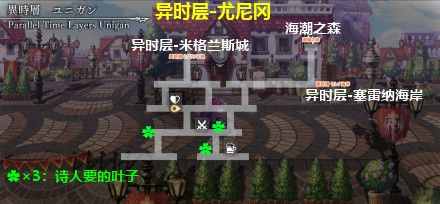 诗人:白天林德。在异时层找10片叶子给他,其中海潮之森2片,塞雷纳海岸2片,尤尼冈3片,圣骑士村3片,位置见各地地图