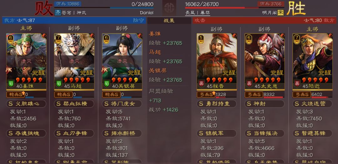 五虎枪的核心思路就俩字,暴力。不管你是横的还是竖的,我就是要把你打成扁的。爆发起来非常地猛,缺点跟优点一样,就是太猛了,刹不住车,遇到减伤、治疗、控制,就会很伤。有兴趣的朋友,可以考虑带箕形阵+奇计良谋试试看,从破军威胜、青州兵、盛气凌敌中去掉两个(我的战法点已近干涸,换不动了)。
