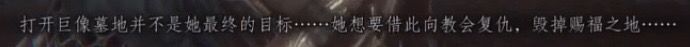伴随着某种仪式 耶库伯之印和马吉安少女的鲜血 巨像墓地的大门终于打开。其中发生了什么我们不得而知 只知道只有教宗希金斯和维伦特狼狈逃出。特蕾莎作为被献祭的少女进入了巨像墓地吗?她在里面经历了什么?后面她又是怎么离开巨像墓地出现在泰伦斯面前的?这些我们一头雾水,我也只能从墓地里白发女子的只言片语中稍微推测下。