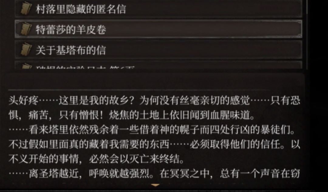 这是特蕾莎在恢复一点记忆后重新来到基塔布,这时的特蕾莎还没完全成为墓地的工具人,她痛恨教会,她想让教会灭亡,她将这一切激烈的感情写进了一个羊皮卷中,同时也写下了对脑海中呼唤的困惑。也是这次愤怒的特蕾莎打伤了杰洛尔德。(特蕾莎好歹也是个女巫,会几首手马吉安法术什么的也正常)我分析特蕾莎此时来基塔布的目的有两个:一是她想知道圣塔底部的耶库伯之印还在不在,如果在的话就想办法拿出来,然后借着印的力量摧毁赐福之地(参考后面的基塔布惨状,和杰洛尔德对特蕾莎行为的分析)