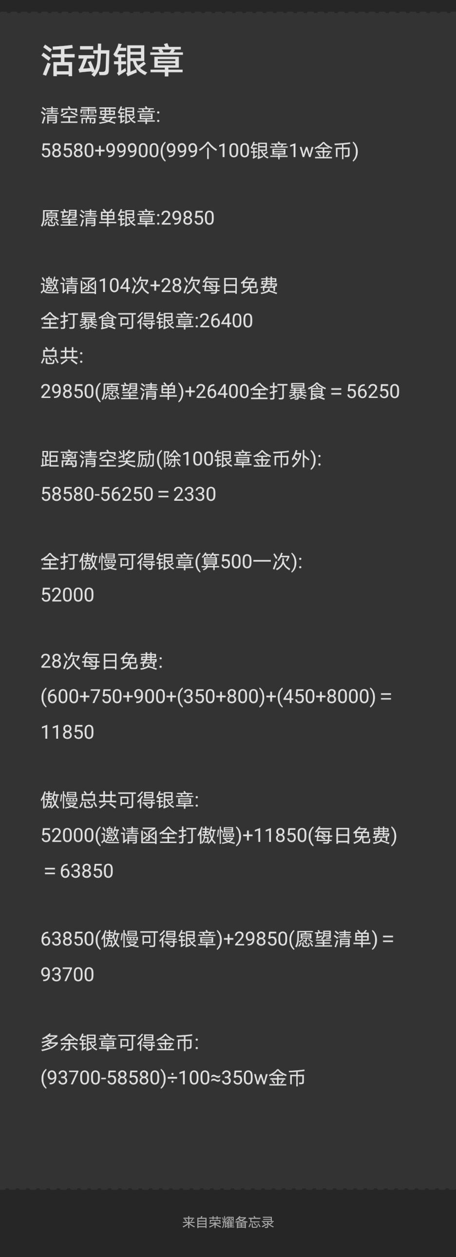 以上为半精确计算每日清空的银章数量,为了方便计算所以每日邀请函按3.5计算,实际是会多的,第一天三次第二天四次,以此类推,通过计算明显看出攒邀请函的比每日清空的多出大约100w金币左右,但每日清空的依然有250w左右的银章溢出收益金币,一边是少100w金币,一边是开傲慢后刷攒的票,这个过程估计会难受几天,当然各位也可以攒到某个其他BOSS的时候开始刷,虽然比全刷傲慢的奖励低一些,但可以一定程度的减轻最后刷傲慢的压力,就看各位自己的选择了