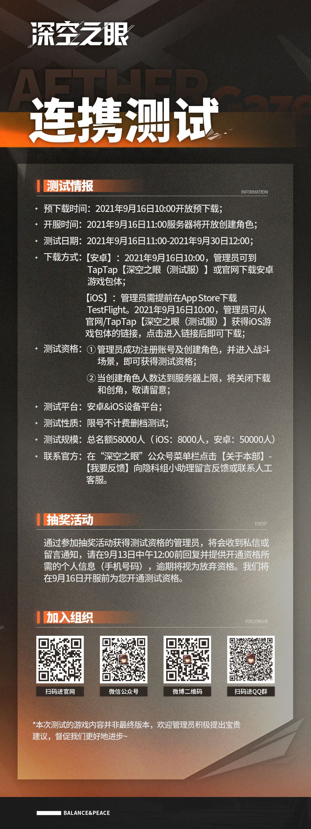 【安卓】:2021年9月16日10:00,管理员可到TapTap【深空之眼(测试服)】或《深空之眼》官网下载安卓游戏包体。