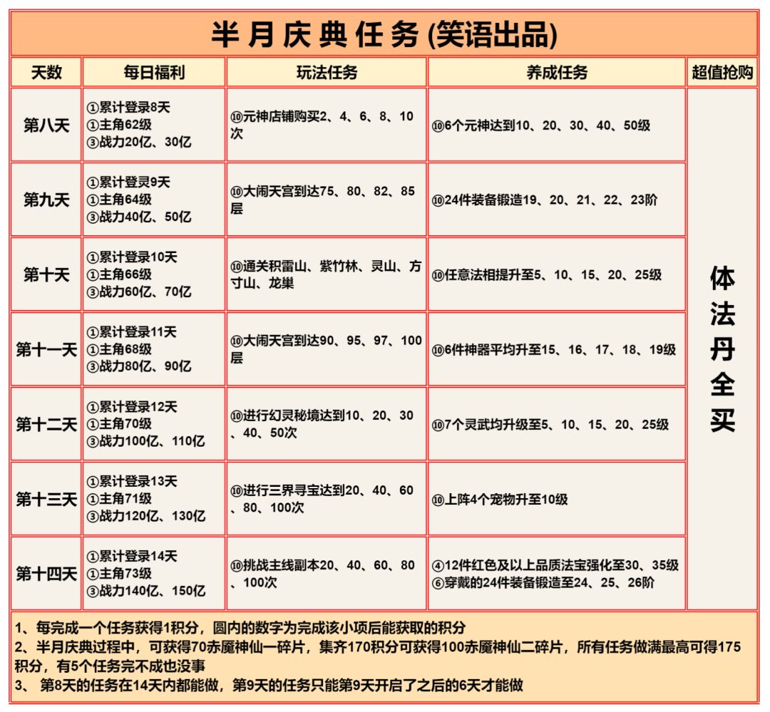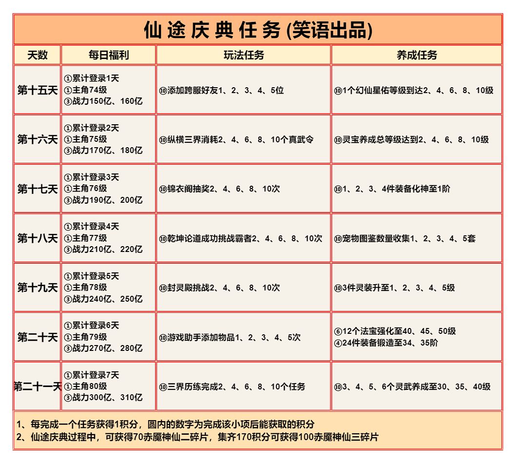 提前查看准备,仙盟商店的精炼原胚、天机令、唤灵符记得每天买完,天机令唤灵符在任务没开启前先存着,除了竞技场外,这些任务都很容易完成。