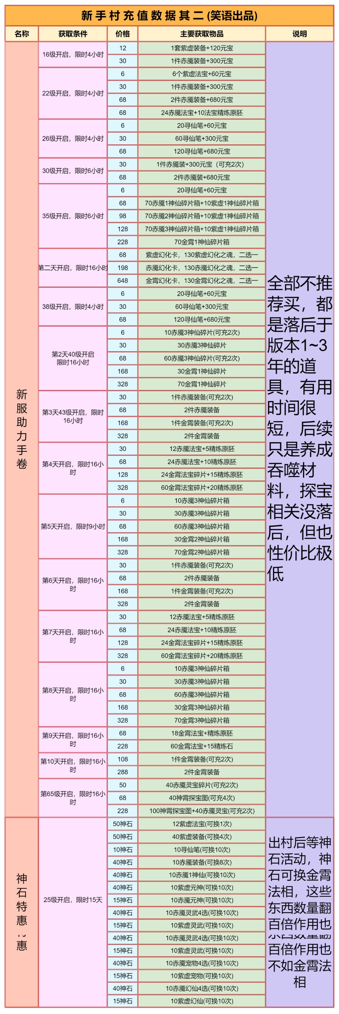 这游戏的新手村有10天,这10天内0氪/首充只用在商城体力丹法力丹每天买满+10个除魔令、某些玩法次数、vip礼包这3个地方花元宝,多的全存着,等出村后的活动花。