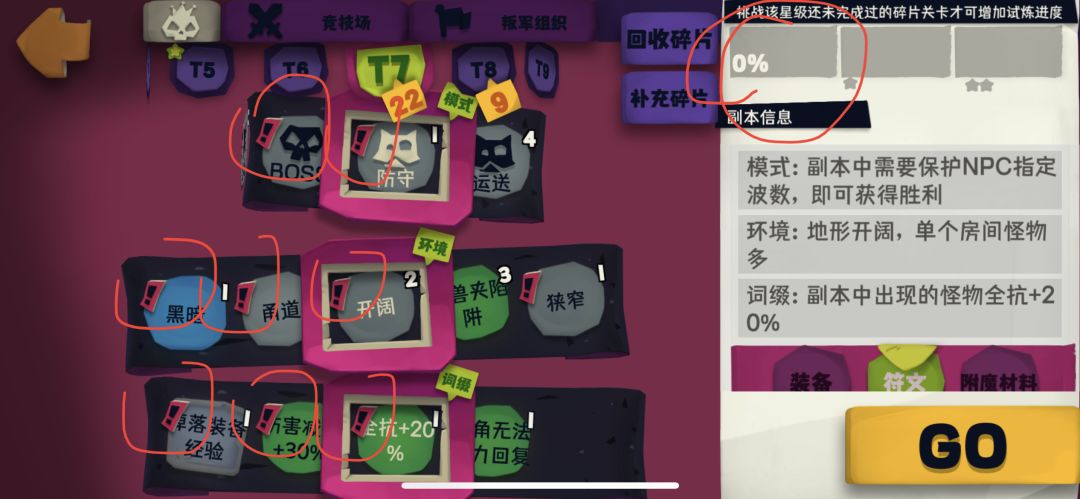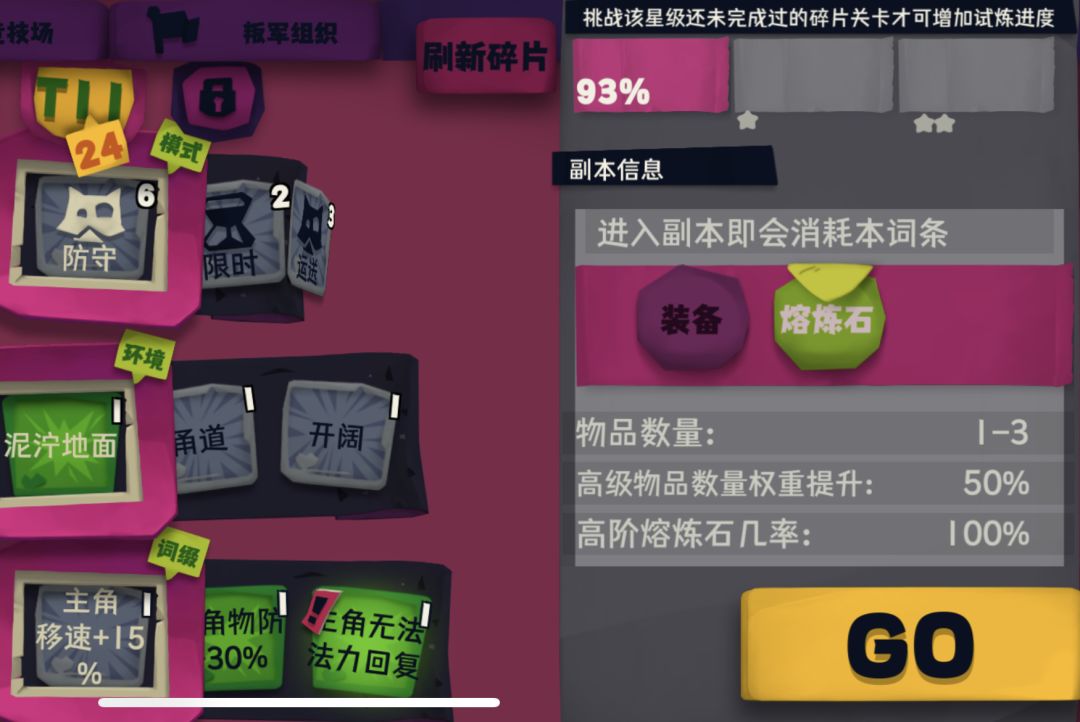 选择有感叹号的词条进入副本并完成后,会增加右边的进度条,达到100%后获得一颗星星,在长时间卡在百分之九十多的进度时,可回收碎片重构碎片来刷新词条。
