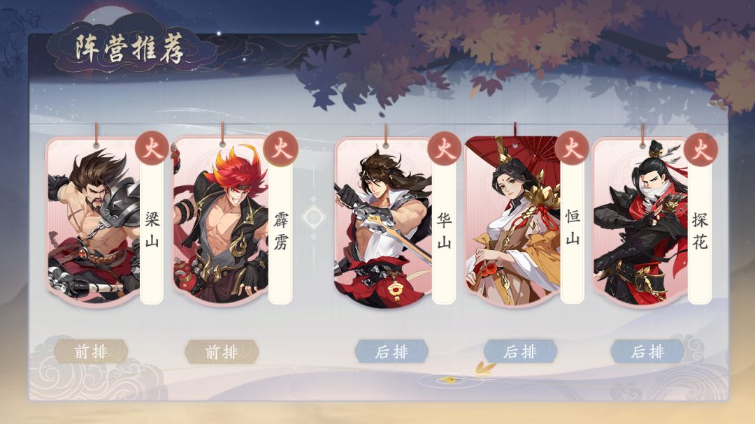 火势力的强力阵容,恒山能够为队伍侠客提供高额的伤害减免,提升队伍整体的硬度,而梁山、霹雳都是火系大侠里“能扛能打”的典范,在自身硬度足够的同时还有高额的输出伤害,配合恒山战斗力和坦度都拉满,再加上华山、探花的高额爆发能力,能够短时间内集火瞬秒敌方后排,融化敌方C位,同时也很难第一时间被秒,输出类型也是多样化的,让敌人防不胜防。