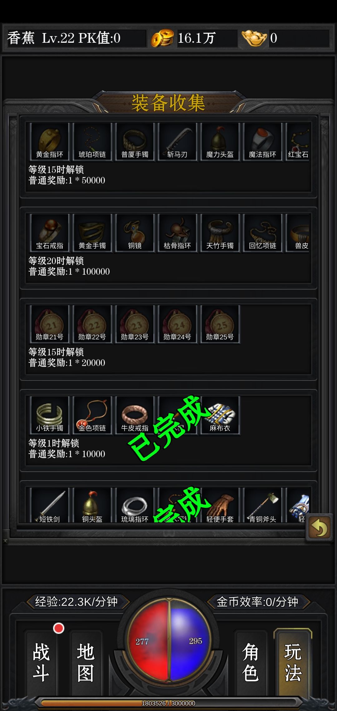 接下来就是3合一 把魔血石合上,然后装备上 ,提升等级继续开图,期间可以把成就如图装备收集,和看广告做一下图在下方