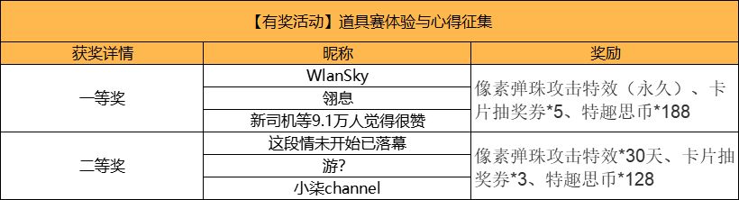 一等奖3名,礼包内含像素弹珠攻击特效(永久)、卡片抽奖券*5、特趣思币*188;