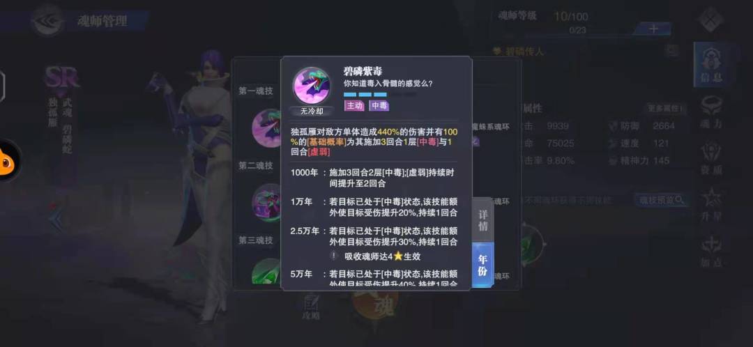 魔蛛二技能,对面控制系魂师行动前,对控制系魂师进行一次普攻。可以吃到普攻特效,且普攻后会降低精神力,这个被动是克制高速火舞,以及其他魂师的神技,缺点是如果目标身上不带毒,那可能就挂不上状态。