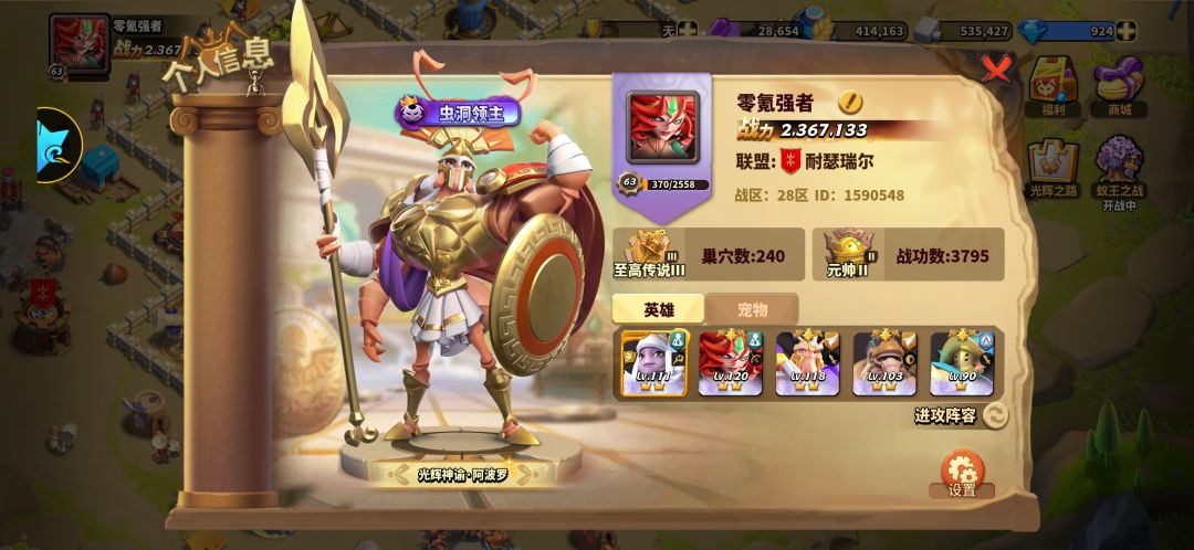 目前进度21天,15本235w战力,巢穴240,爬塔450,真五钻二布狄卡和图拉真,包里各还有两个本体。各项指标来讲还算是走在前列的。