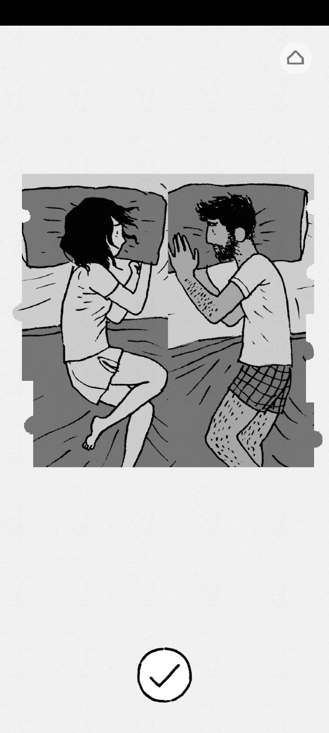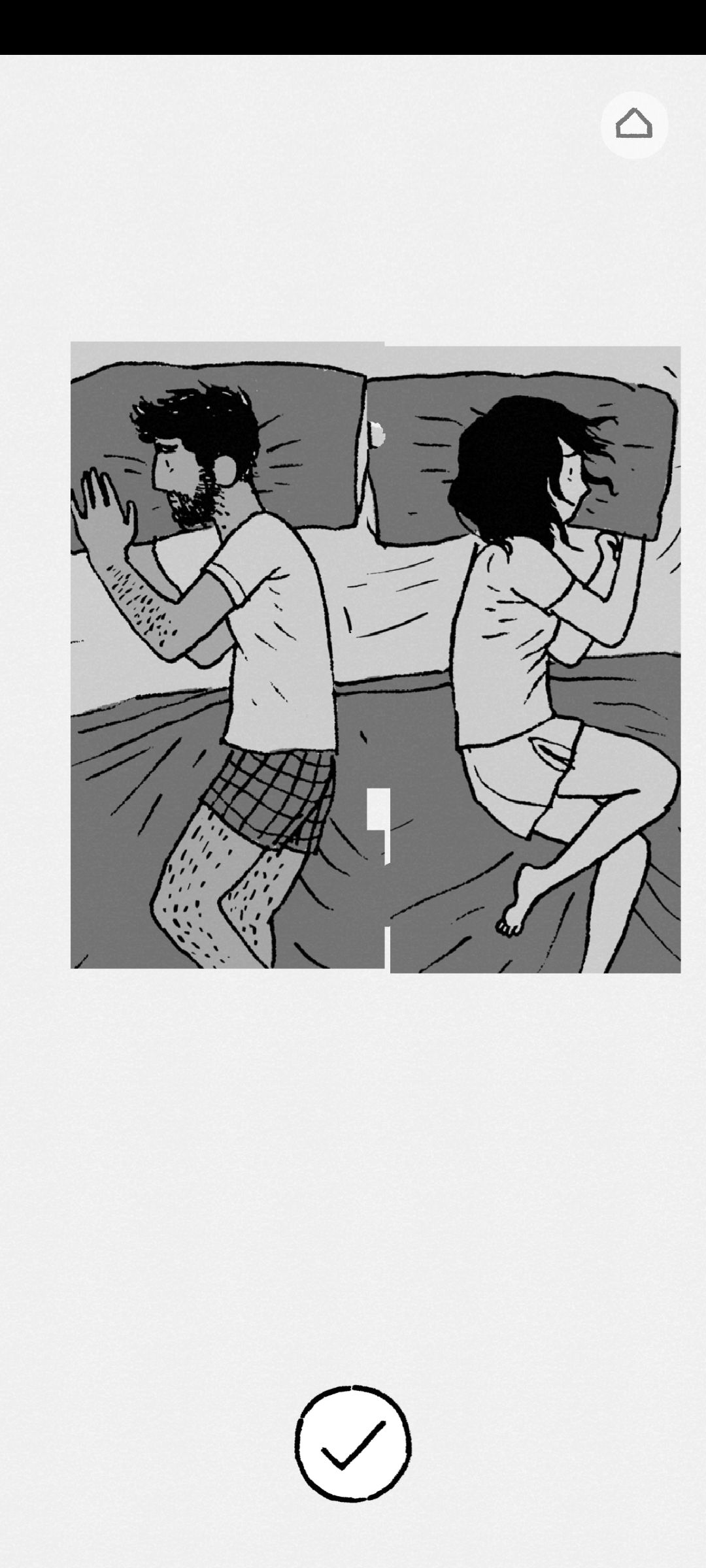 在争吵那一关,以为只要自己将男女主睡觉时面向一起就能缓解他们之间的关系。拼完才发现,无论是正向还是背向,他们都无法再拼成一块,代表了他们的感情已经破裂,就像《珊瑚海》中的歌词:毁坏的沙雕如何重来,有裂痕的爱怎么重盖? 并不是每段感情都能如人所愿,希望以后的我,能够珍惜每一段感情,学会理解,学会倾听,懂得珍惜爱我的人。也能像女主一样带着曾经的感情,放下所有的芥蒂,重新出发。