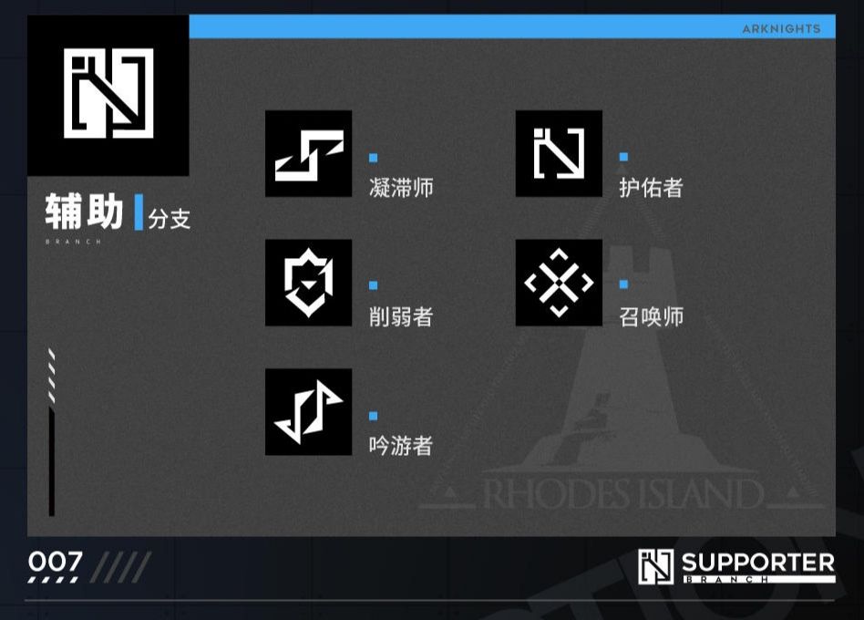 凝滞师以安洁丽娜和铃兰为代表,是标准的减速辅助;护佑者目前只有一个月禾;削弱者以巫恋、初雪为代表,属于降低敌人属性的拐;召唤师以麦哲伦、希音、梅儿为代表,利用召唤物作战;吟游者以斯卡蒂和空为代表,通常不攻击,开技能时对敌人造成效果或者提升己方干员属性。新干员则是又一个新的分支,工匠,一个全新的模板。