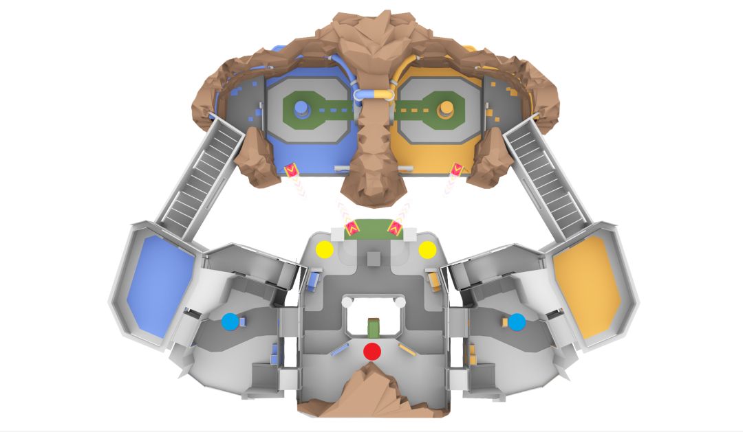 新赛场在整体地图结构上与「终点站(水晶攻防01)」有着非常明显的差异。在终点站,选手们从复活点出生后,无论是选择进攻或是防守,都是同一条路线;而在这张新地图中,我们希望选手们从在复活点出生的那一刻开始,就能够进行策略的选择。