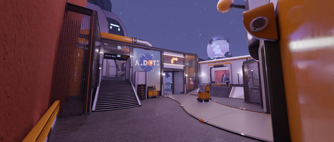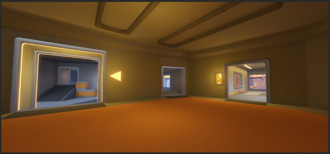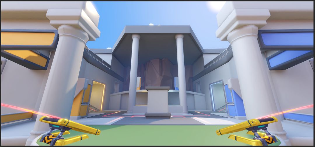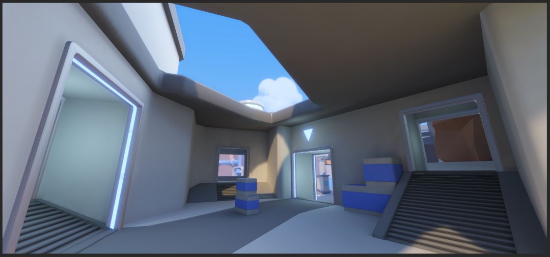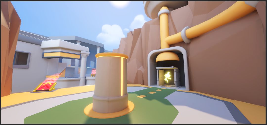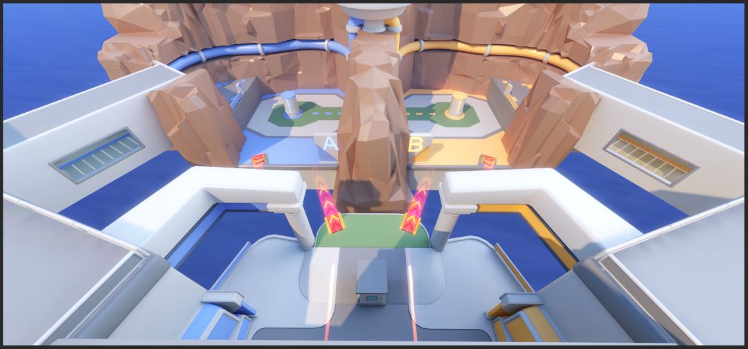 面积大、视距长,是这个赛场的一大特色。但这也可能带来一个问题:不熟悉这个赛场的选手,可能会迷路、甚至找不到敌方水晶。在开发和内部测试过程中,我们发现这张地图中水晶位置的引导性确实不够直观,必须增加更多的方向引导。