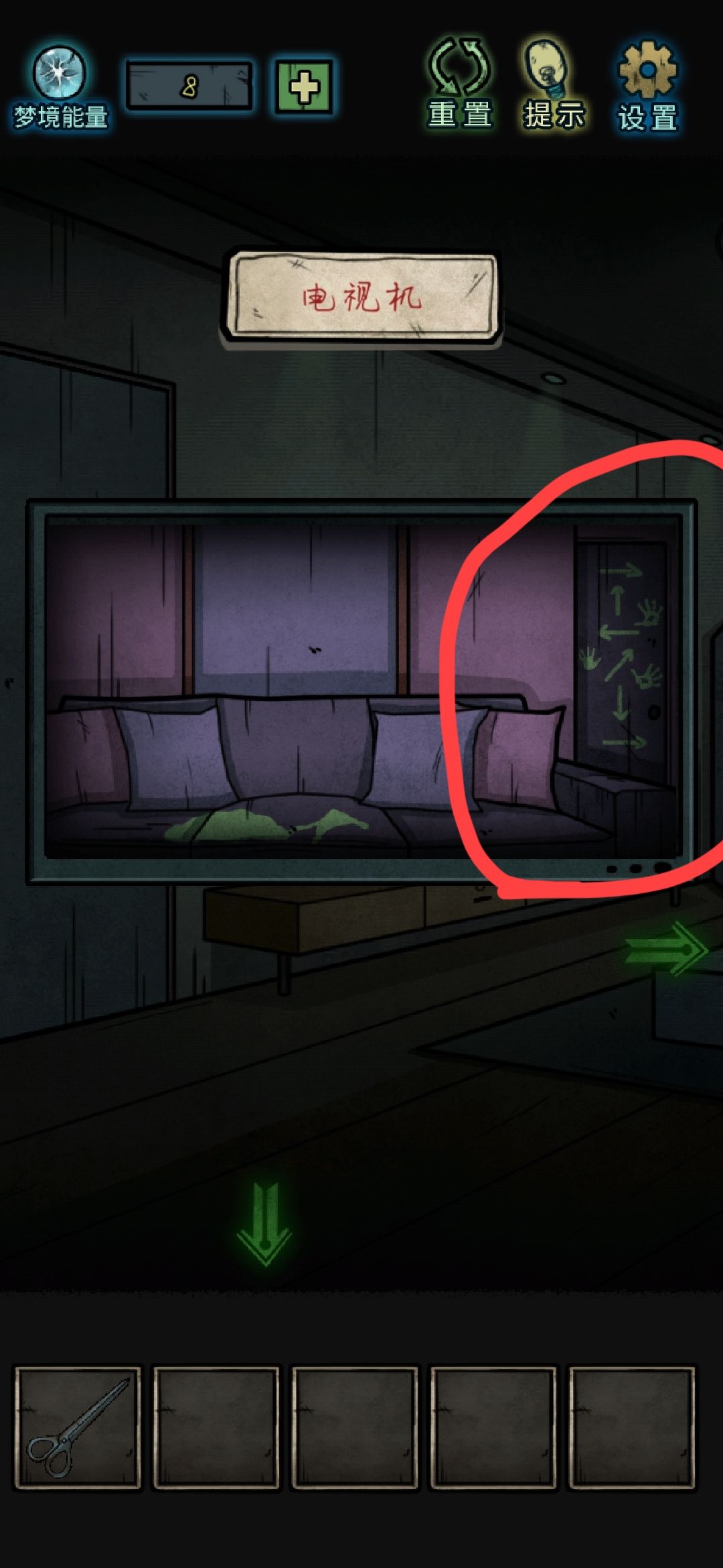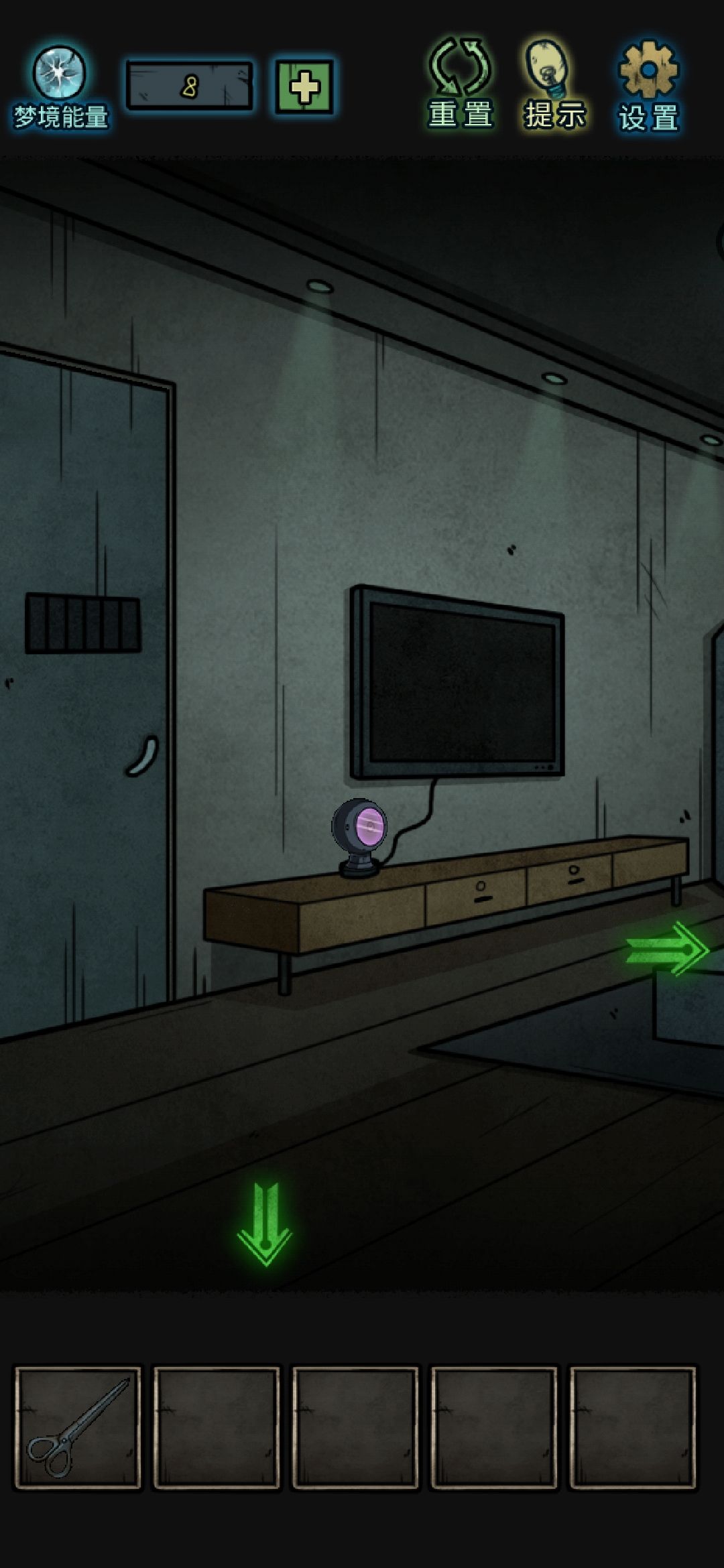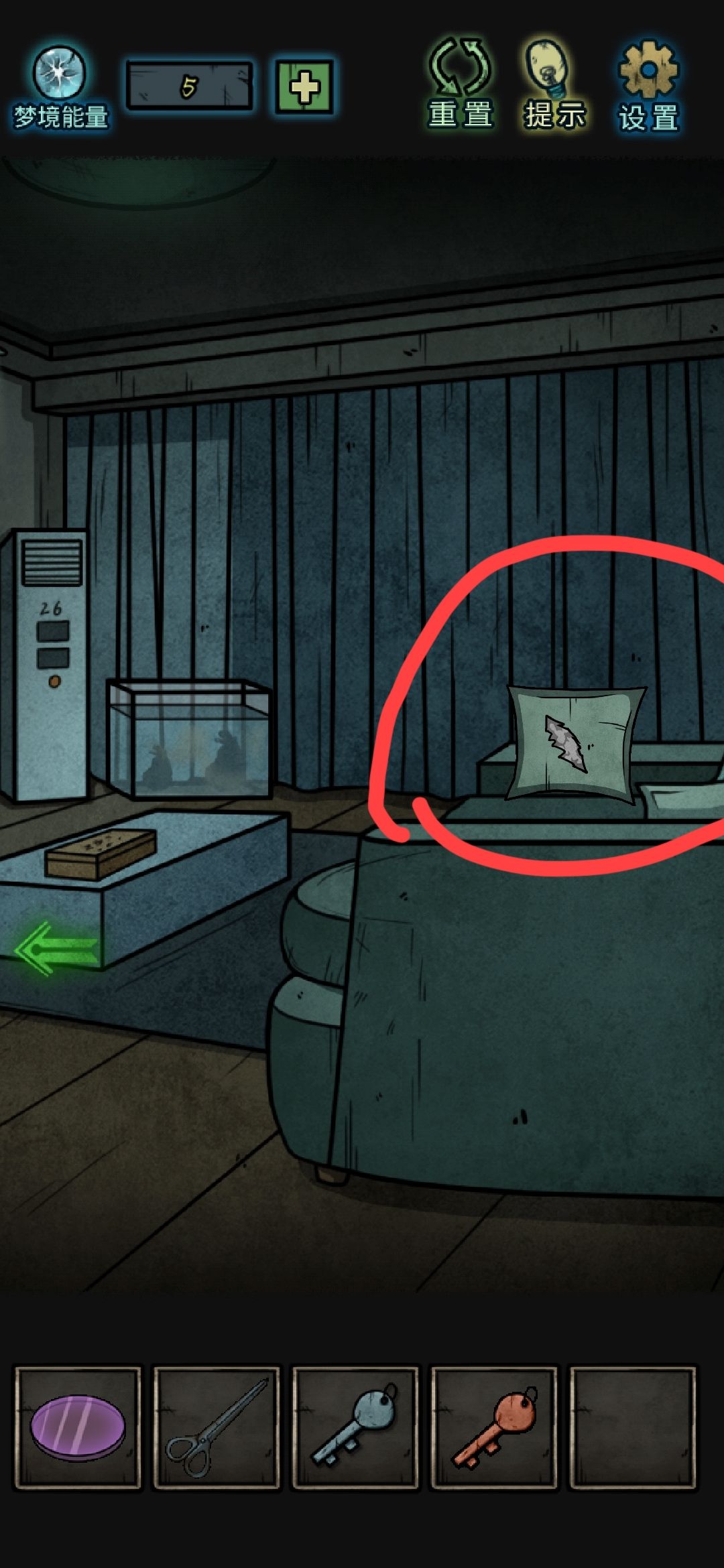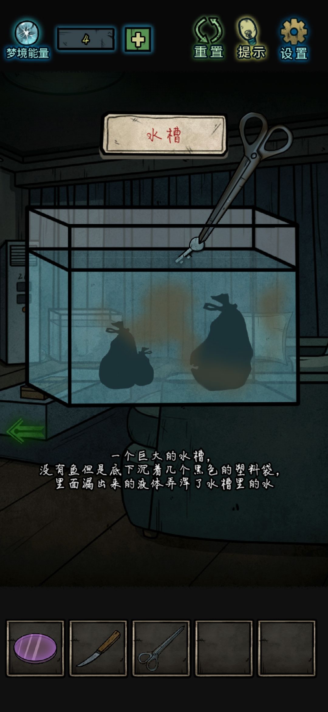 切换到第二场景,拾取沙发底的长钳子,用钳子夹取水槽里的钥匙