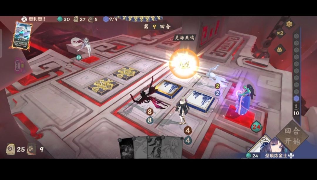 九回合梦璃一位灵海共鸣4位化身,2位陆明,5位化身。幽莲2位黑衣3位亡灵(自己都不清楚我为什么到现在还不开大了)回合末如下图