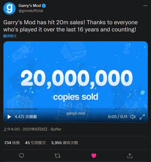 《Garry's Mod》最初只是一个起源引擎的mod,让玩家可以随意使用引擎内置的物理、模型和工具。它最早于 2004 年发布,2006 年在 Steam 上推出独立产品。今天(9月8日),官方推特宣布,《Garry's Mod》已经售出 2 千万份。