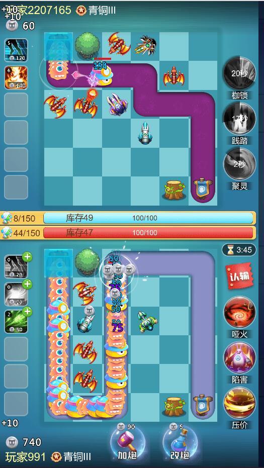 对局双方起点处同时产生若干怪物,己方消灭掉1个怪物后获得一定数量银币,并给对方战场将额外增加2个怪物。当对方怪物数量超过一定数量,或血量被扣完,或局内倒计时结束时判断输赢。配合局内技能机制,对战过程将会充满争分夺秒、见招拆招的竞技感。