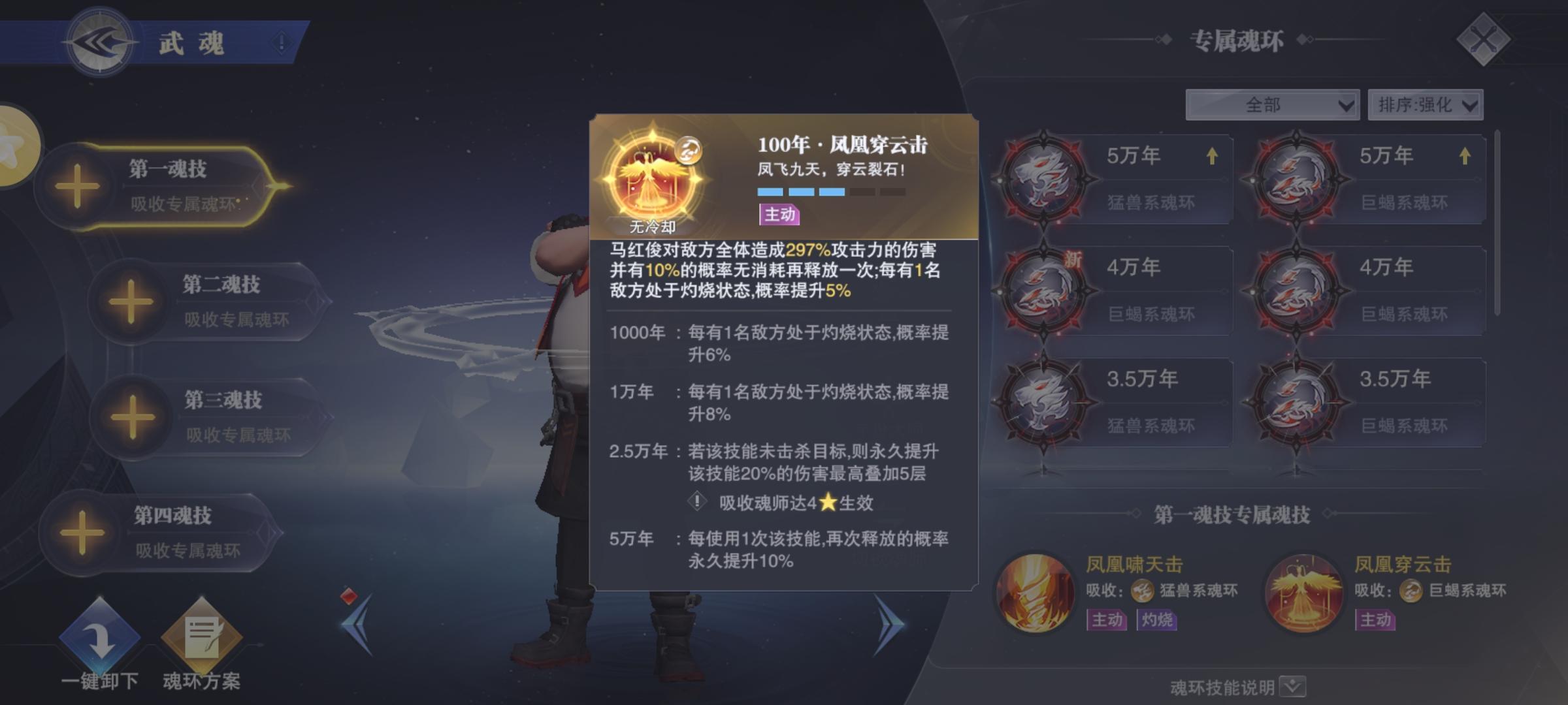 第五魂环的选择,可以有两种,第一种提升马红俊的暴击率,然后提升爆伤,第二种配合马红俊的第四魂技,造成伤害就可以附加攻击力百分比的一定伤害给对方。