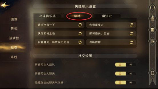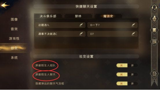 PC端的社交设置中包括了在决斗俱乐部、禁林、魔法史课堂等场景中的局内快捷消息内容设置,快捷消息会帮你省去不少打字的时间,很适合用来和队友及时交流沟通调整战斗策略,这一部分手机端也相同。