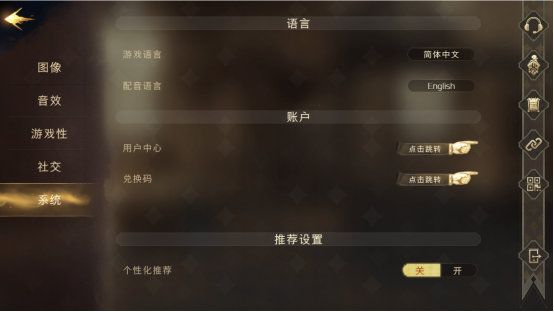 PC端:系统设置中有调整游戏语言、配音语言以及跳转用户中心、使用兑换码等功能;
