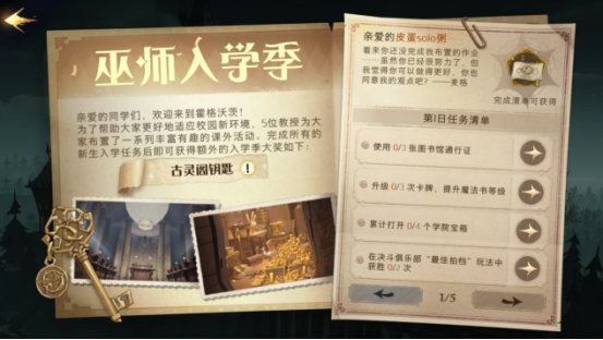 完成五位教授布置的“五天入学任务”后,可领取一枚古灵阁钥匙,小巫师可前往对角巷古灵阁开启属于小巫师的专属礼物,获得随机传说卡牌、图书馆通行证、宝石等奖励!