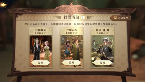 社团活动由社员在社团舞会、社团问答、社团飞行赛中投出人气最高的活动,活动开启后社团的贡献越高,活动奖励会越丰厚;每日社团活动前三名成员还将会额外获得社团勋章,可在社团场景正上方点击商店,兑换稀有卡牌和传说卡牌!